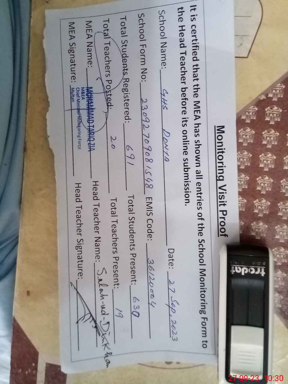 | Monitoring Date: 27-09-2023 | Start Time: 27-09-2023 10:19 AM | End Time: 27-09-2023 10:32 AM | Name of MEA: Mu**** Ta**** Zi**** | |