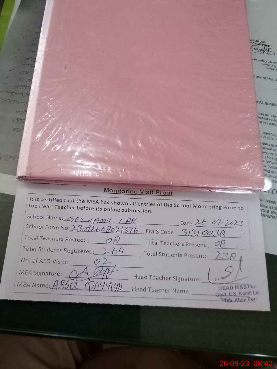 | Attendance Register | Head Teacher | MEA with School | Visit Proof |