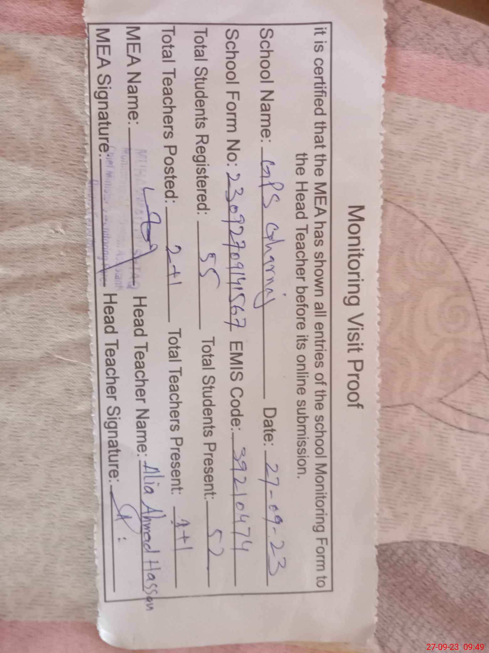 | Attendance Register | Head Teacher | MEA with School | Visit Proof |