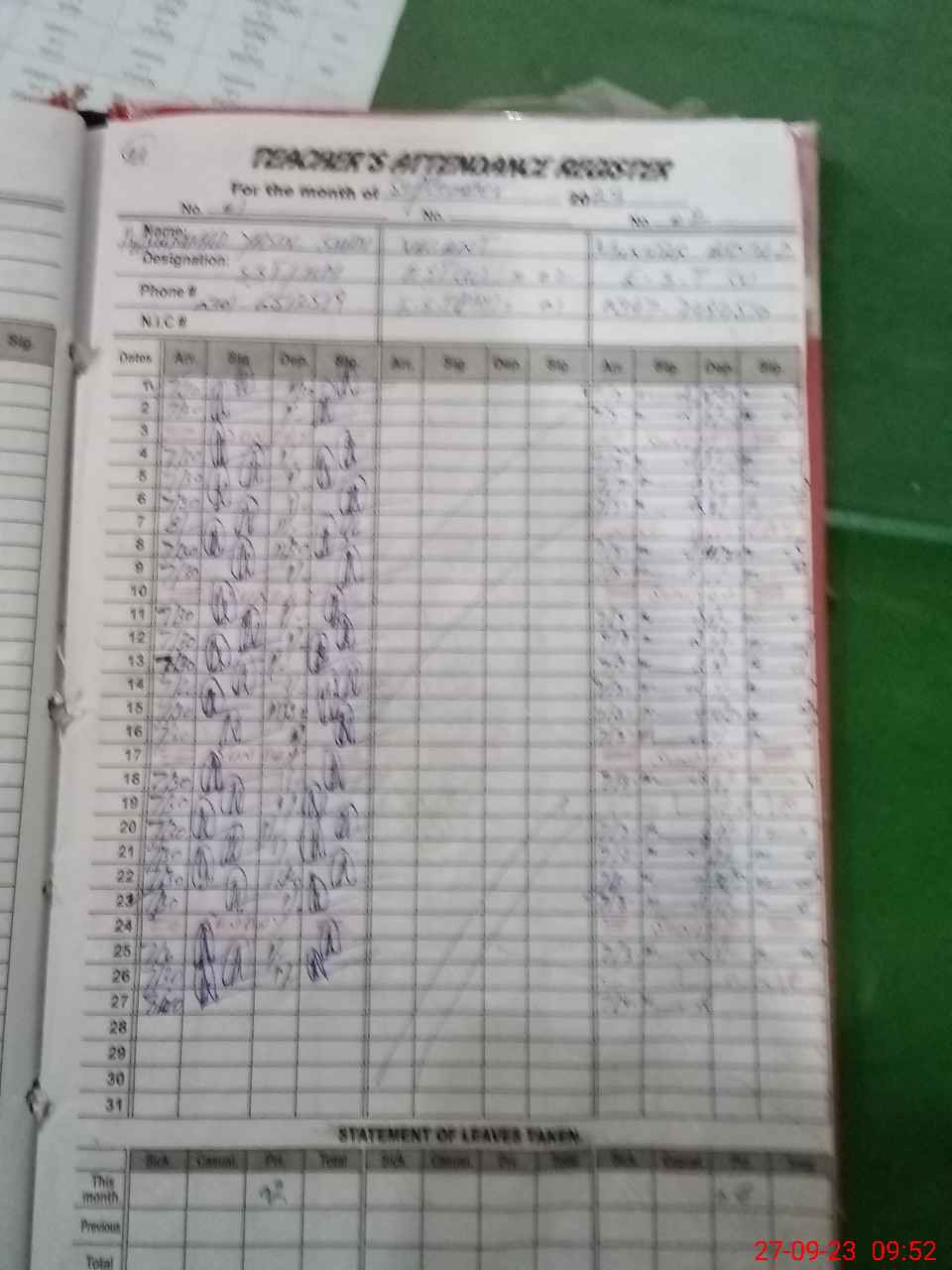 | CNIC | Full Name | Designation | R/C | Absence During Last Calender Month |