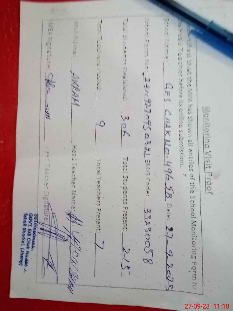 | Attendance Register | Head Teacher | MEA with School | Visit Proof |