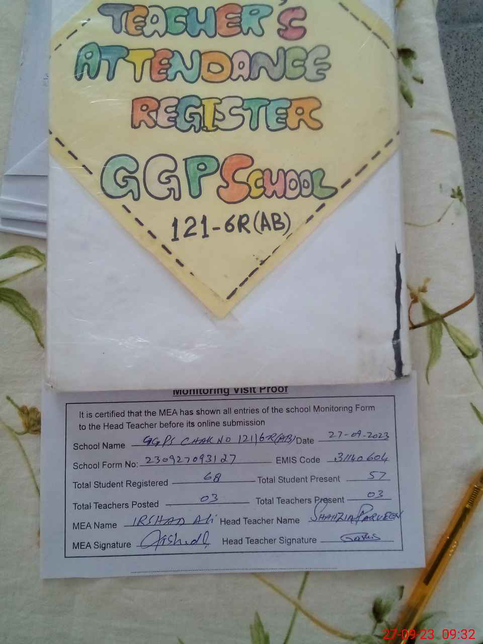 | Attendance Register | Head Teacher | MEA with School | Visit Proof |