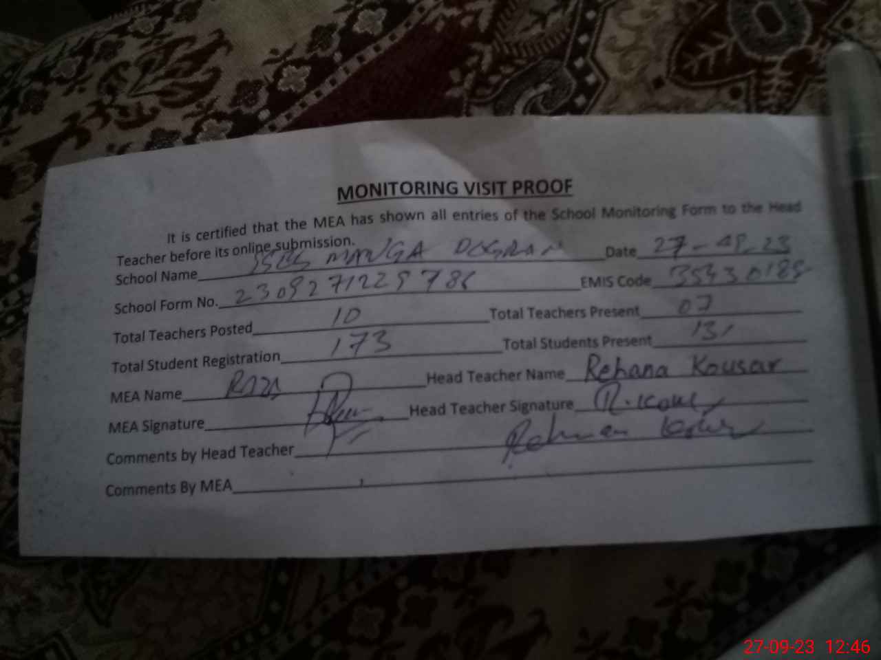 | Attendance Register | Head Teacher | MEA with School | Visit Proof |
