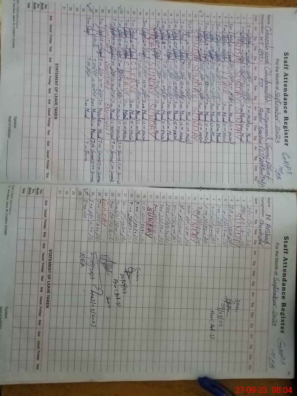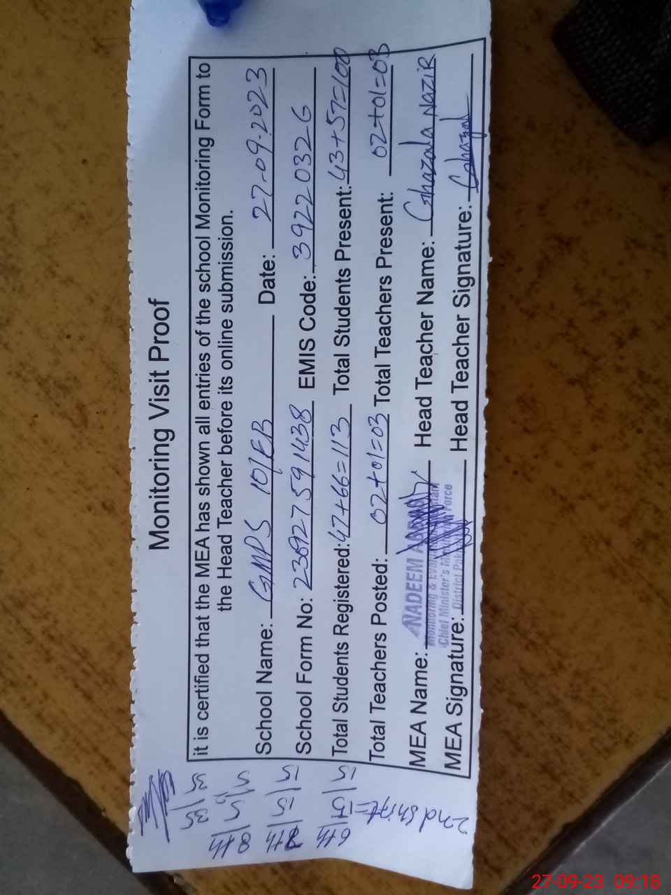 | Attendance Register | Head Teacher | MEA with School | Visit Proof |