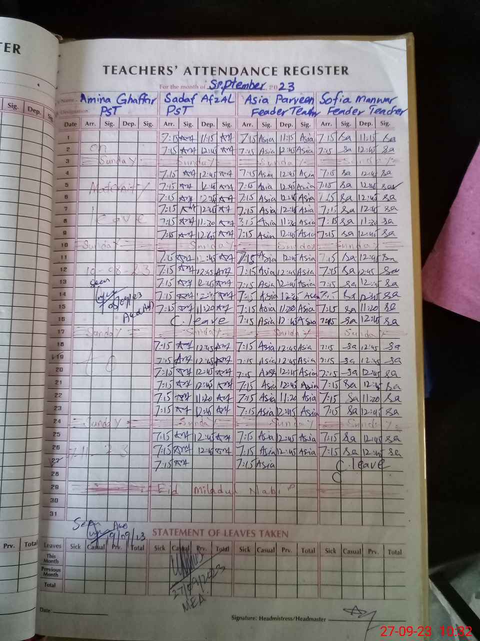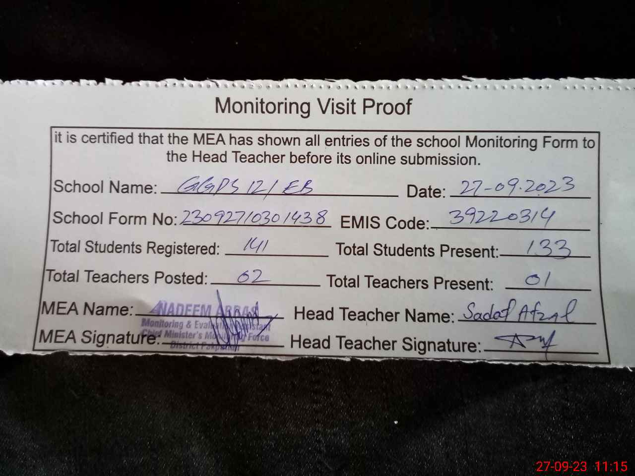 | Attendance Register | Head Teacher | MEA with School | Visit Proof |