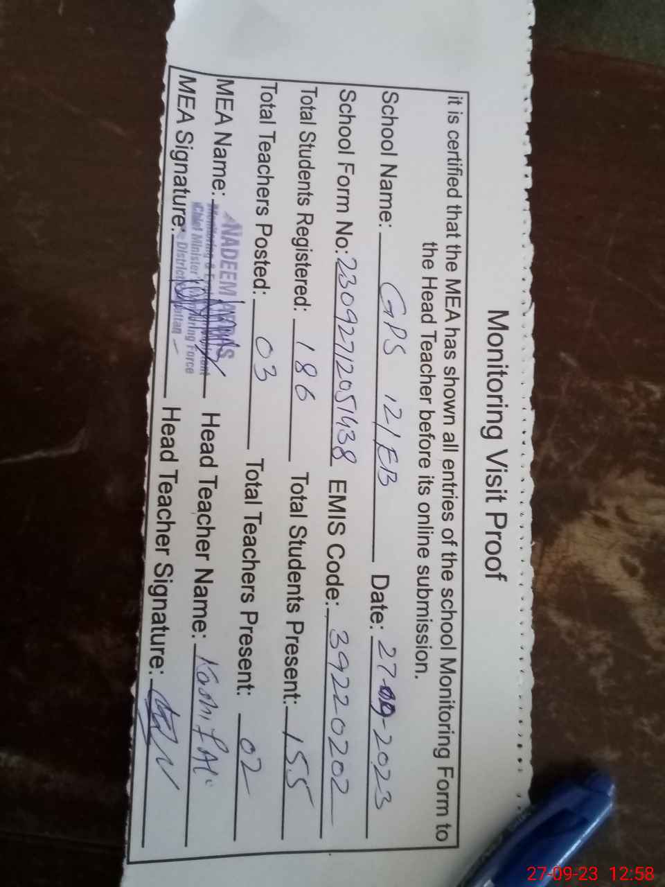 | Attendance Register | Head Teacher | MEA with School | Visit Proof |