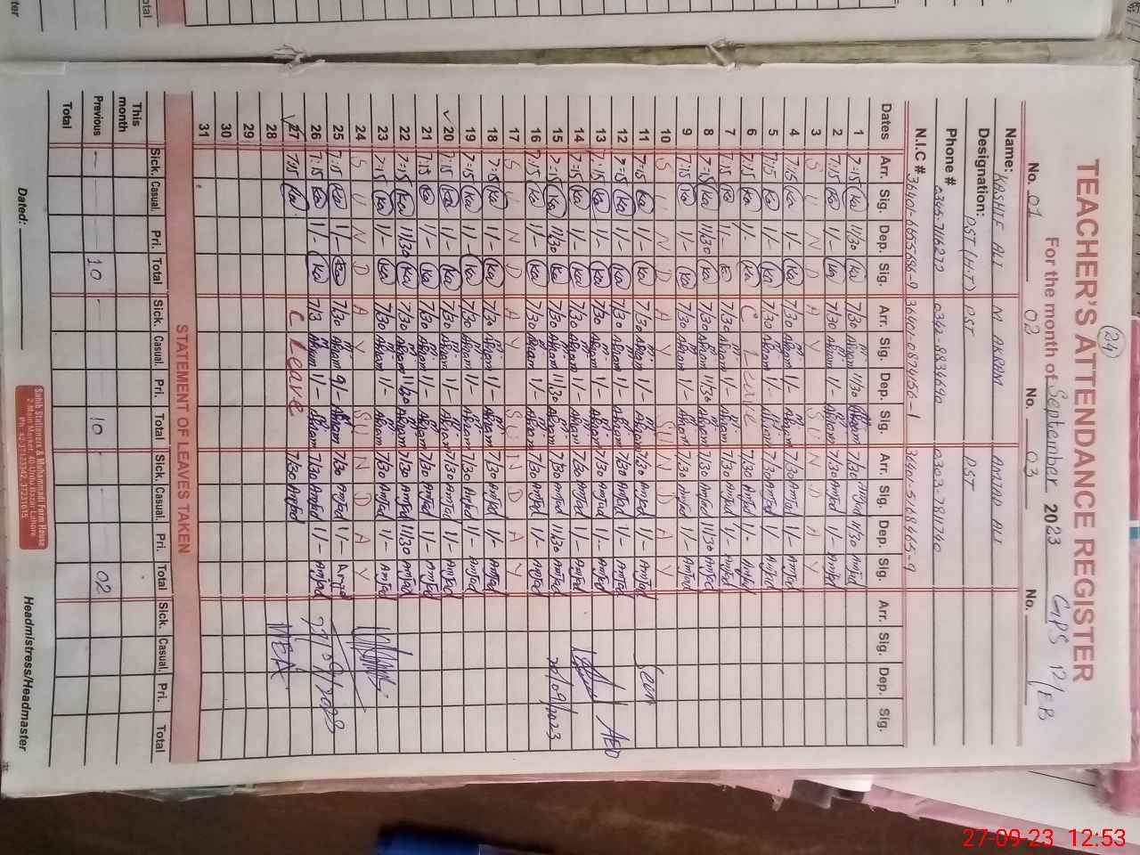 | Name: Ka**** Al**** Designation: (School Headmaster's/Headmistress's) PST Phone/Cell Number: 03**** |