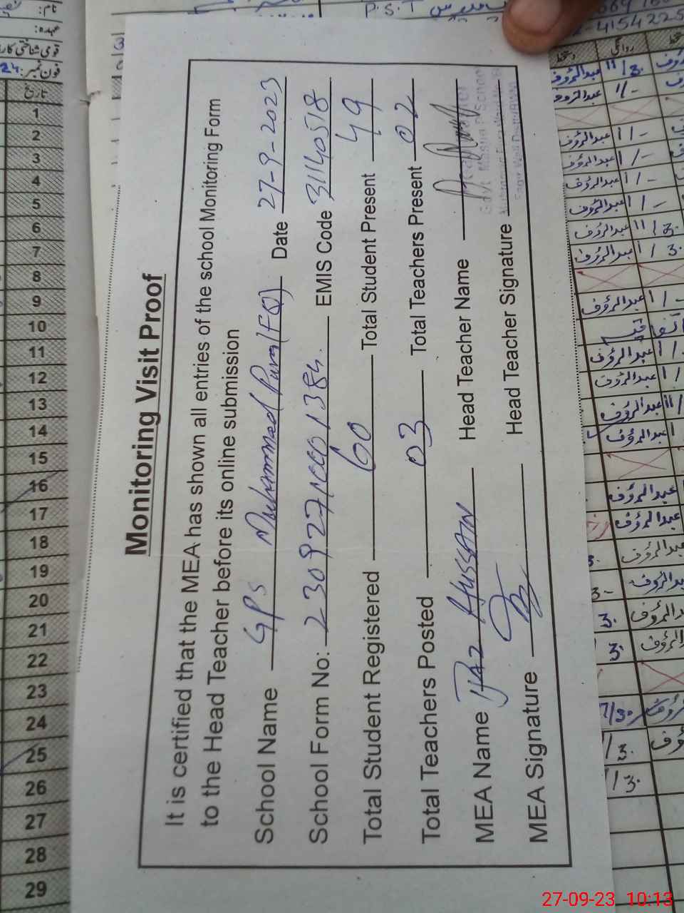 | Attendance Register | Head Teacher | MEA with School | Visit Proof |