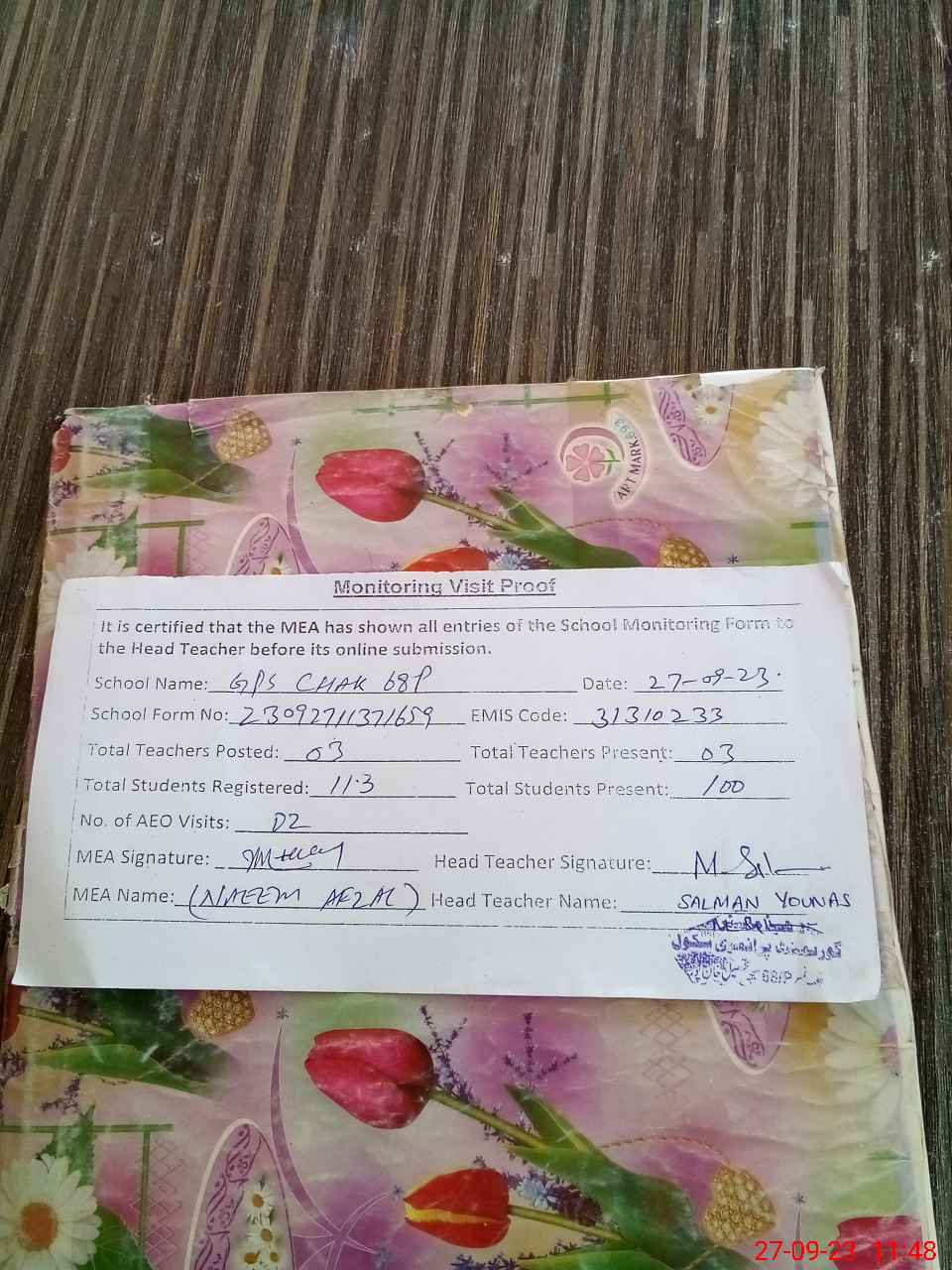 | Attendance Register | Head Teacher | MEA with School | Visit Proof |