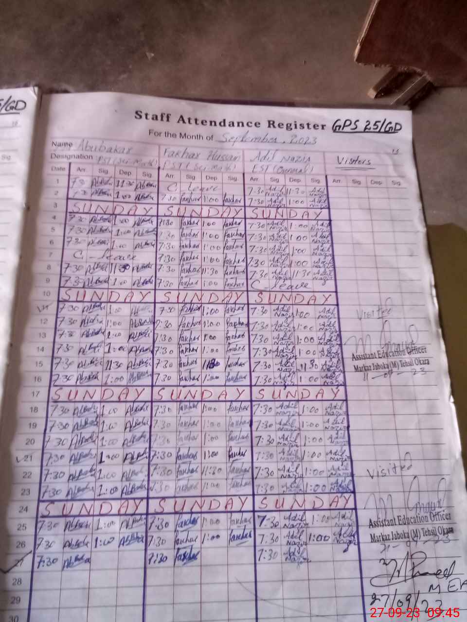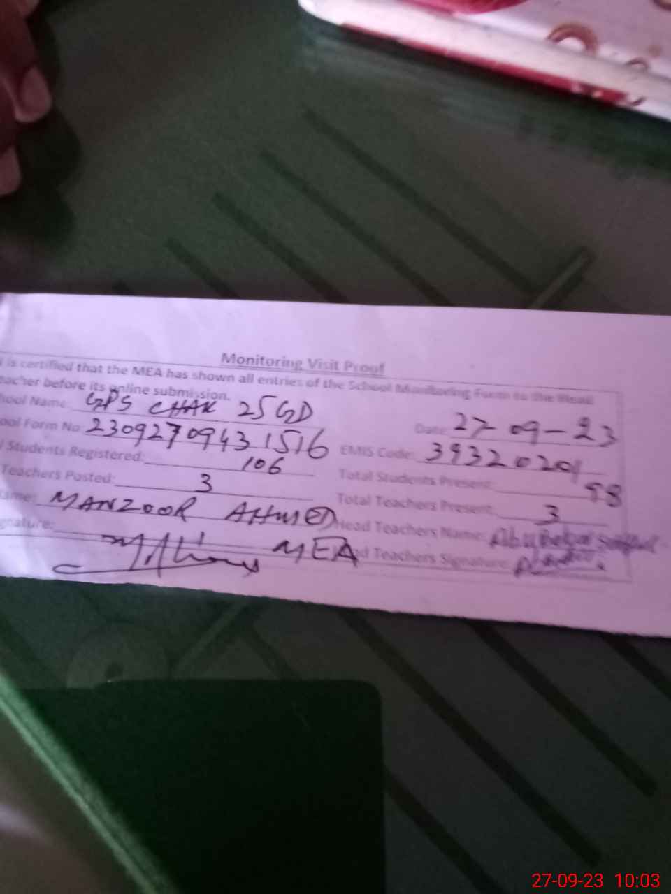 | Name: Ab**** Si**** Designation: (School Headmaster's/Headmistress's) PST Phone/Cell Number: 03**** |