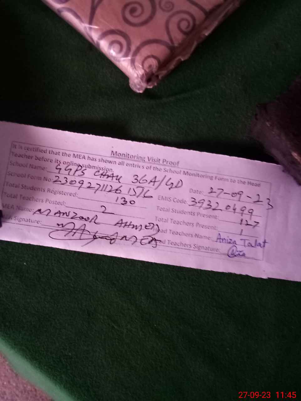 | Attendance Register | Head Teacher | MEA with School | Visit Proof |