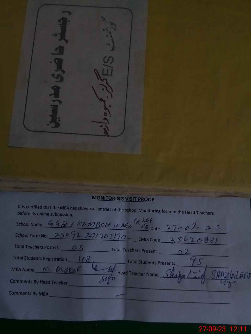 | Attendance Register | Head Teacher | MEA with School | Visit Proof |