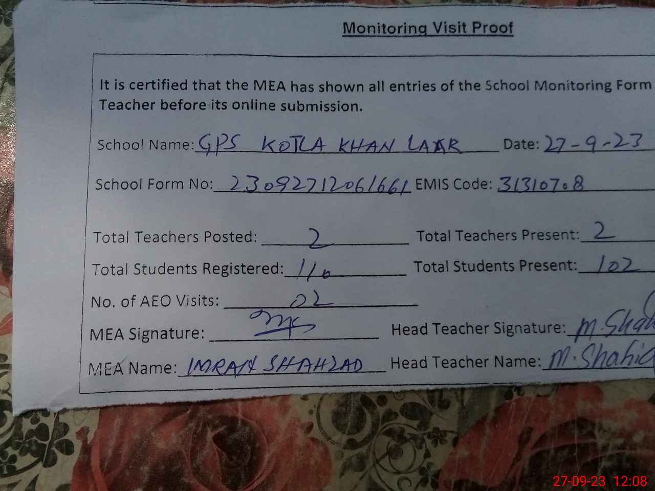 | EMIS Code: 31310708 | Name of School: GPS KOTLA KAHN LAR | |||
