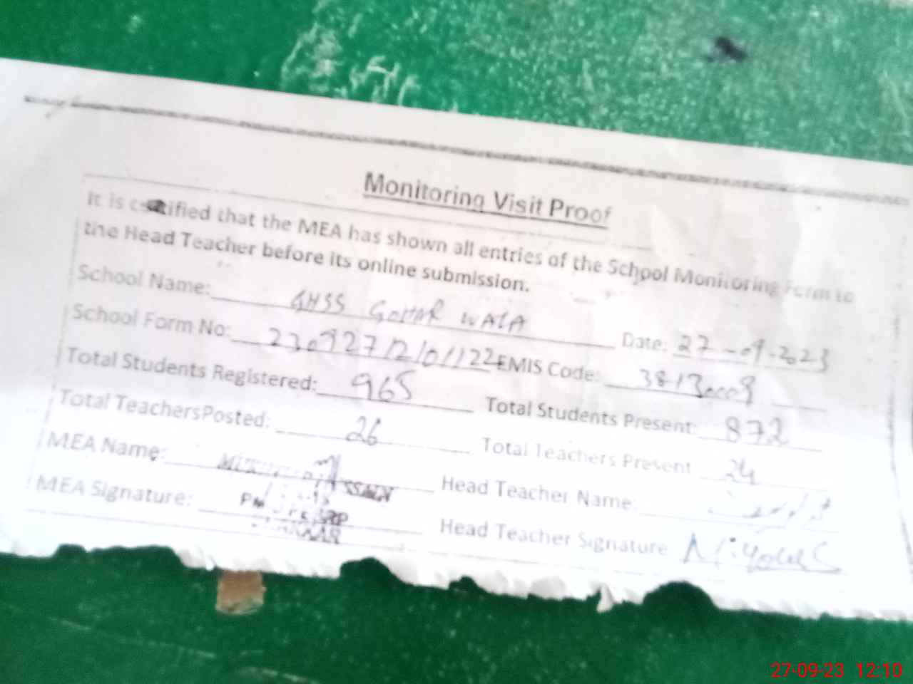| Attendance Register | Head Teacher | MEA with School | Visit Proof |