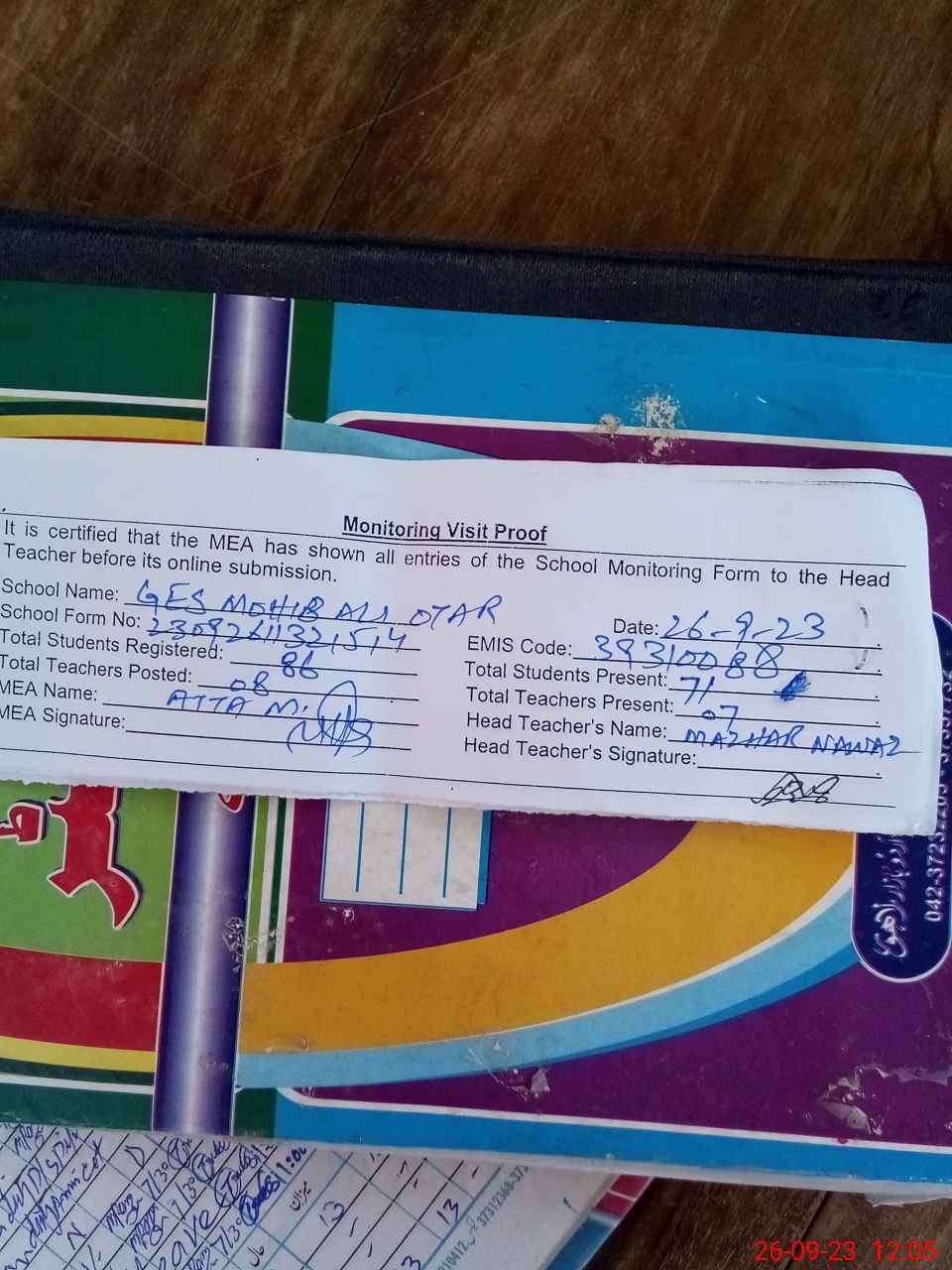 | Attendance Register | Head Teacher | MEA with School | Visit Proof |