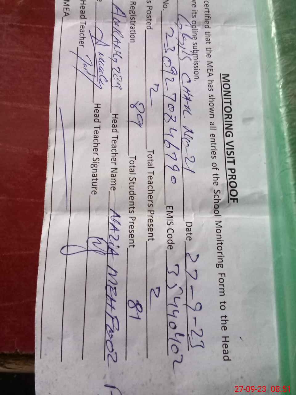 | Attendance Register | Head Teacher | MEA with School | Visit Proof |