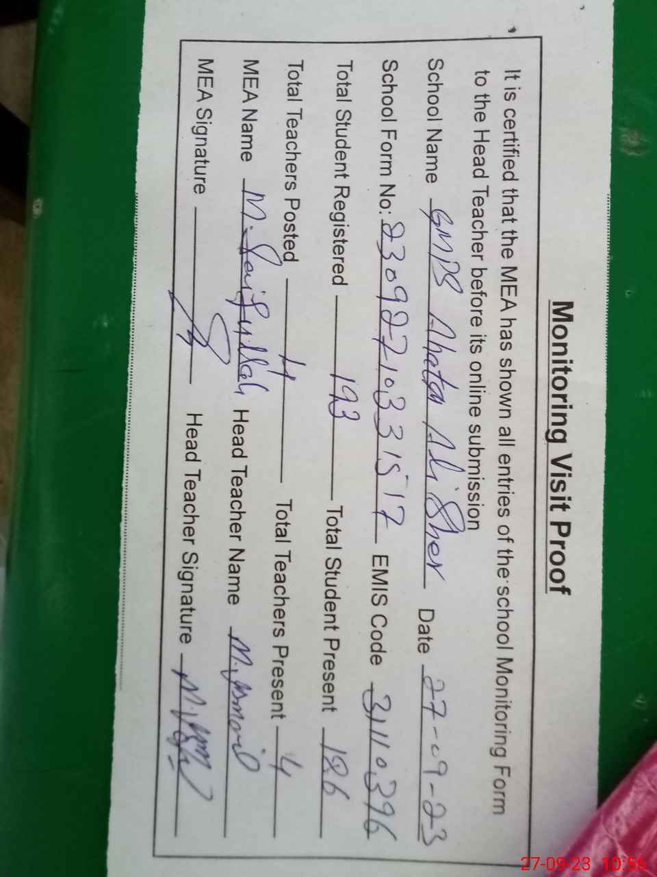 | EMIS Code: 31110396 | Name of School: GMPS AHATA ALI SHER | |||
