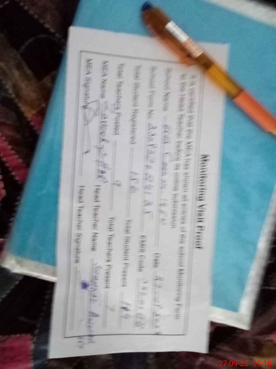 | Attendance Register | Head Teacher | MEA with School | Visit Proof |