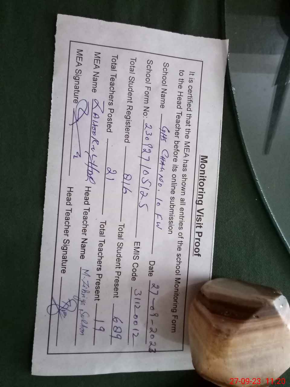| Attendance Register | Head Teacher | MEA with School | Visit Proof |