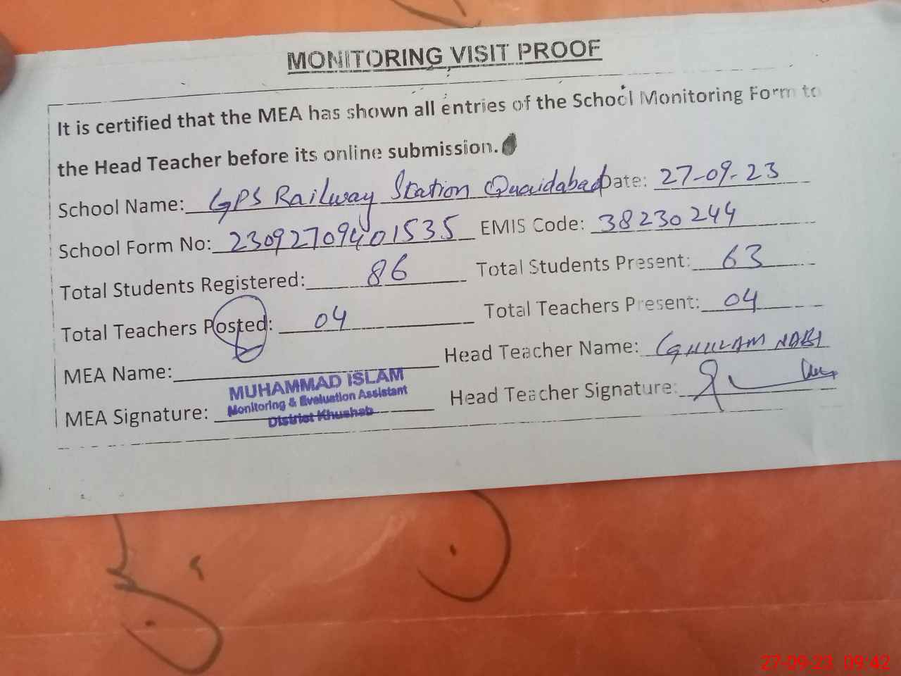 | Attendance Register | Head Teacher | MEA with School | Visit Proof |