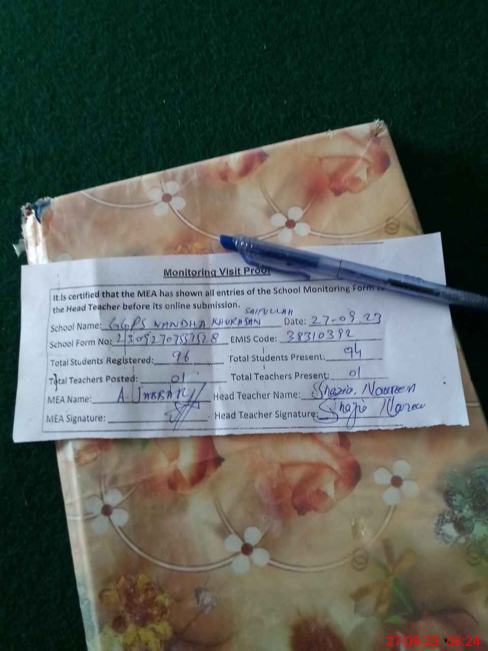 | Attendance Register | Head Teacher | MEA with School | Visit Proof |