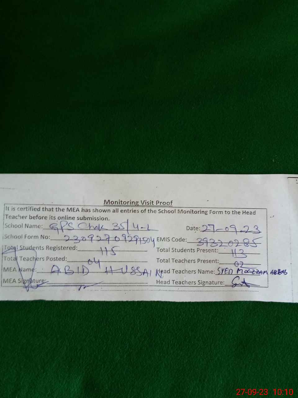 | Attendance Register | Head Teacher | MEA with School | Visit Proof |