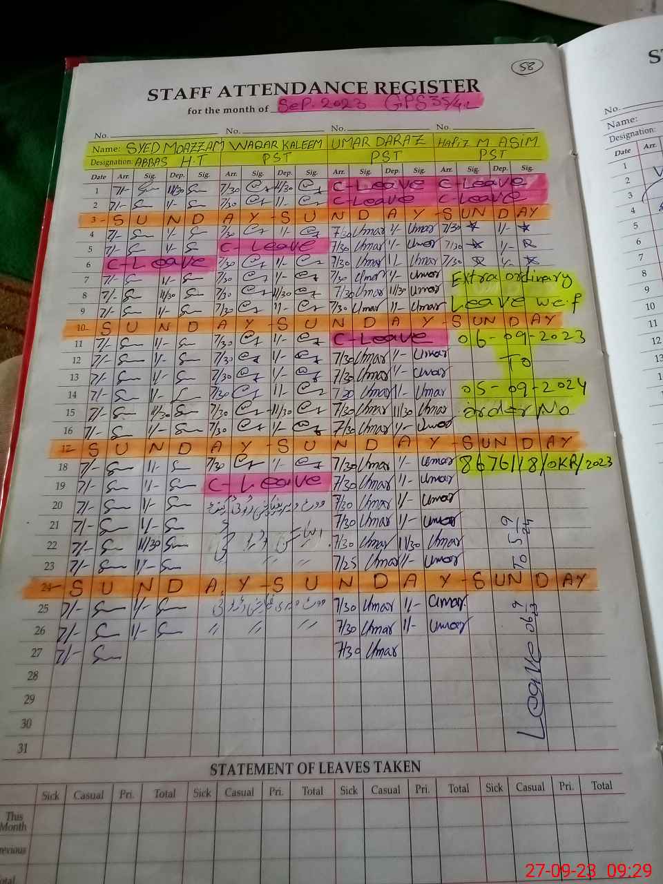 | Leave | Duty | Absent | Maternity | Medical | Ex- Pak |