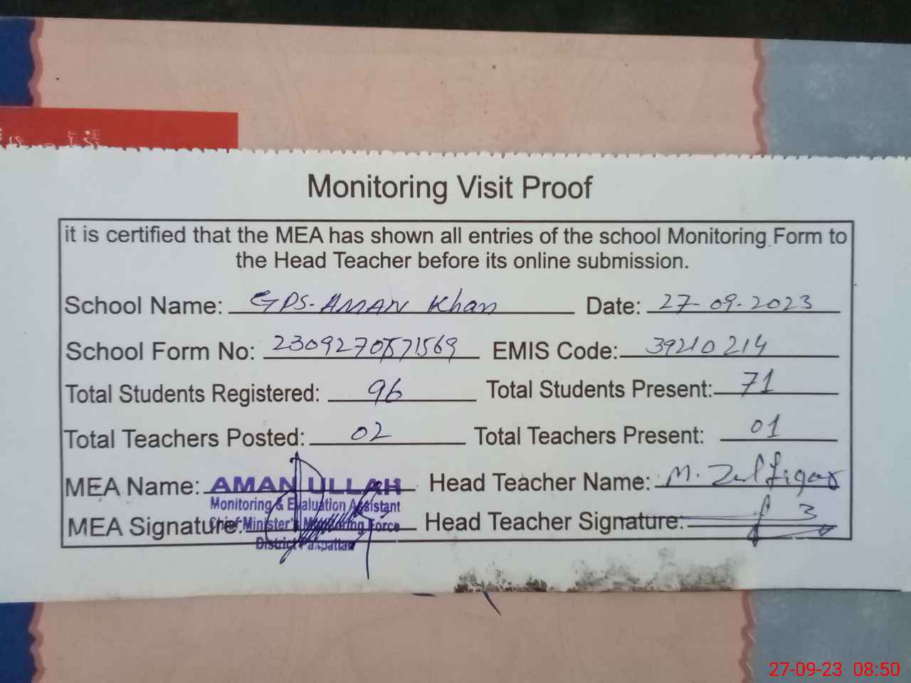 | EMIS Code: 39210214 | Name of School: GPS AMAN KHAN | |||