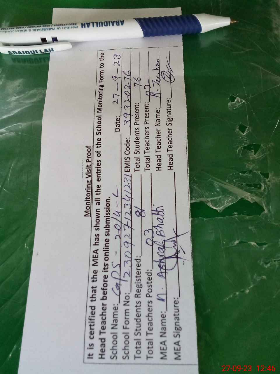| Attendance Register | Head Teacher | MEA with School | Visit Proof |