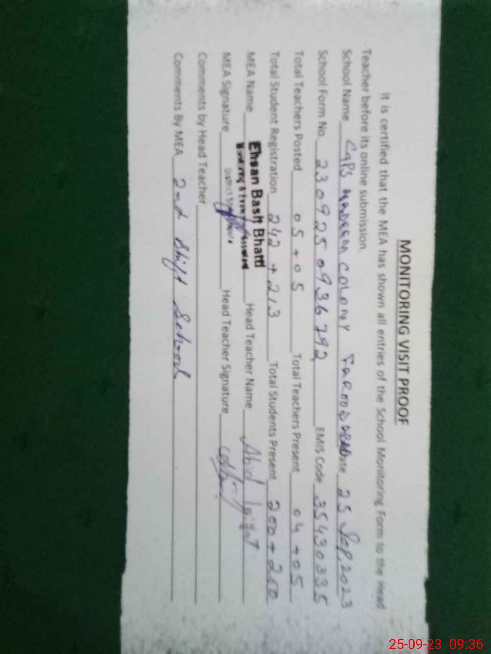 | Attendance Register | Head Teacher | MEA with School | Visit Proof |