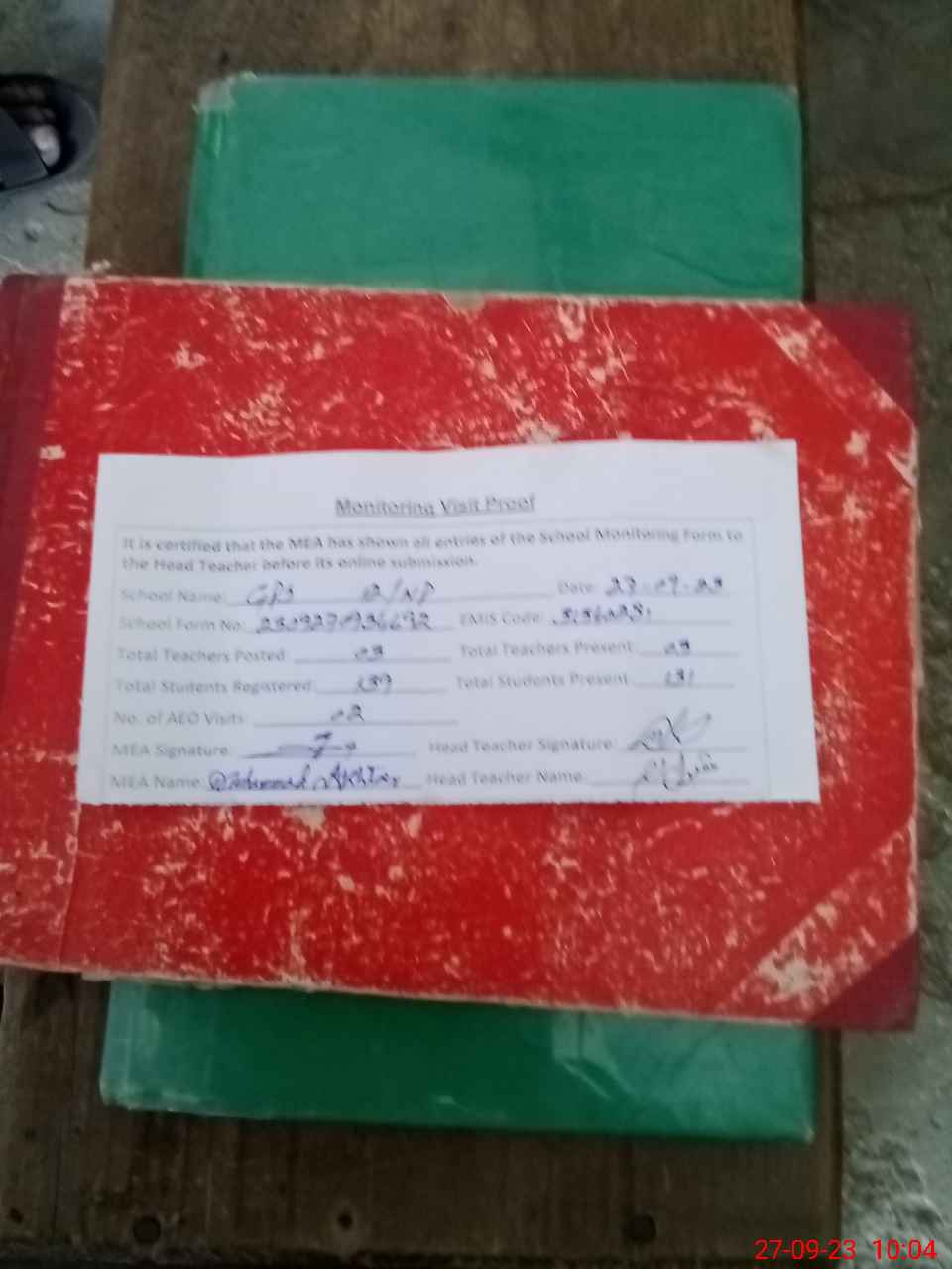 | Attendance Register | Head Teacher | MEA with School | Visit Proof |
