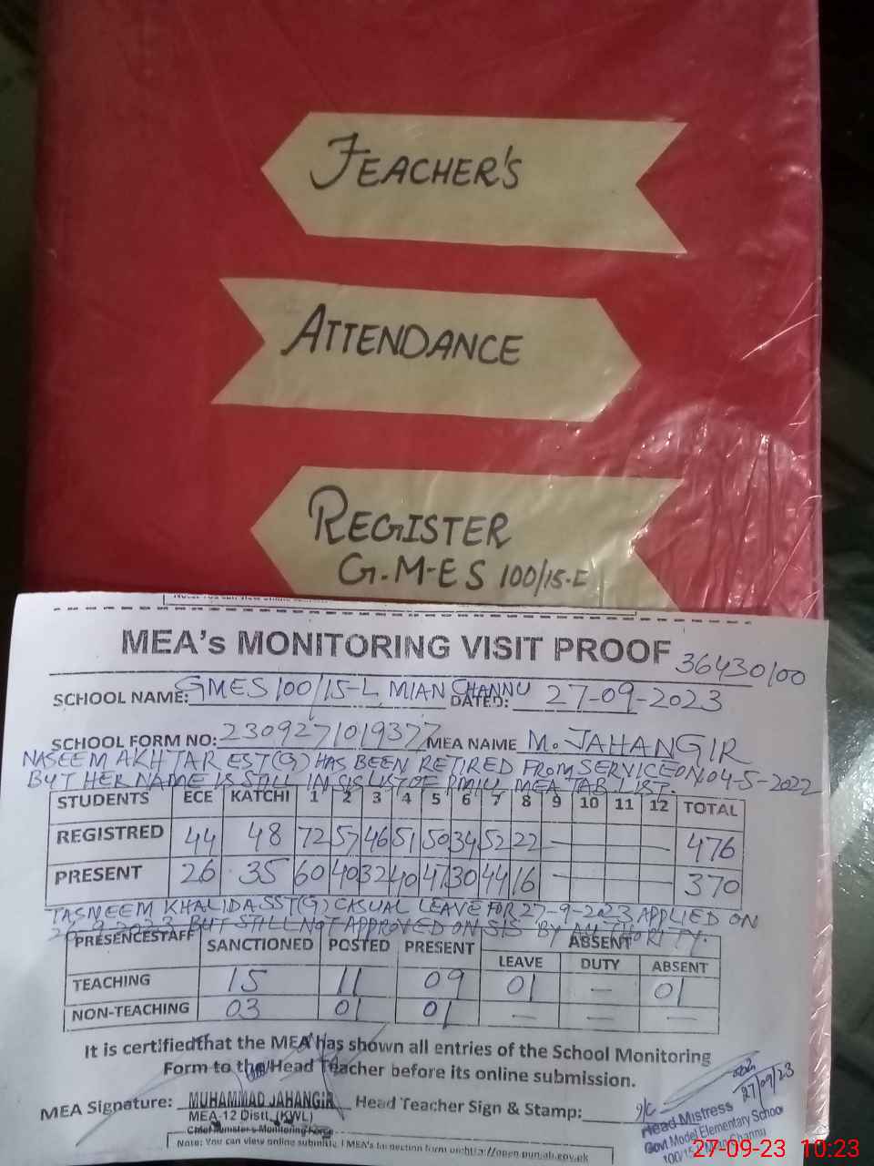 | Attendance Register | Head Teacher | MEA with School | Visit Proof |