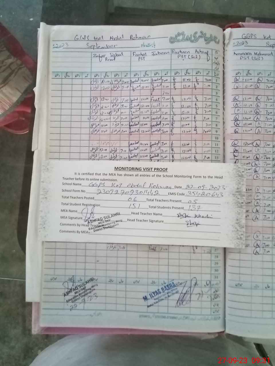 | Attendance Register | Head Teacher | MEA with School | Visit Proof |