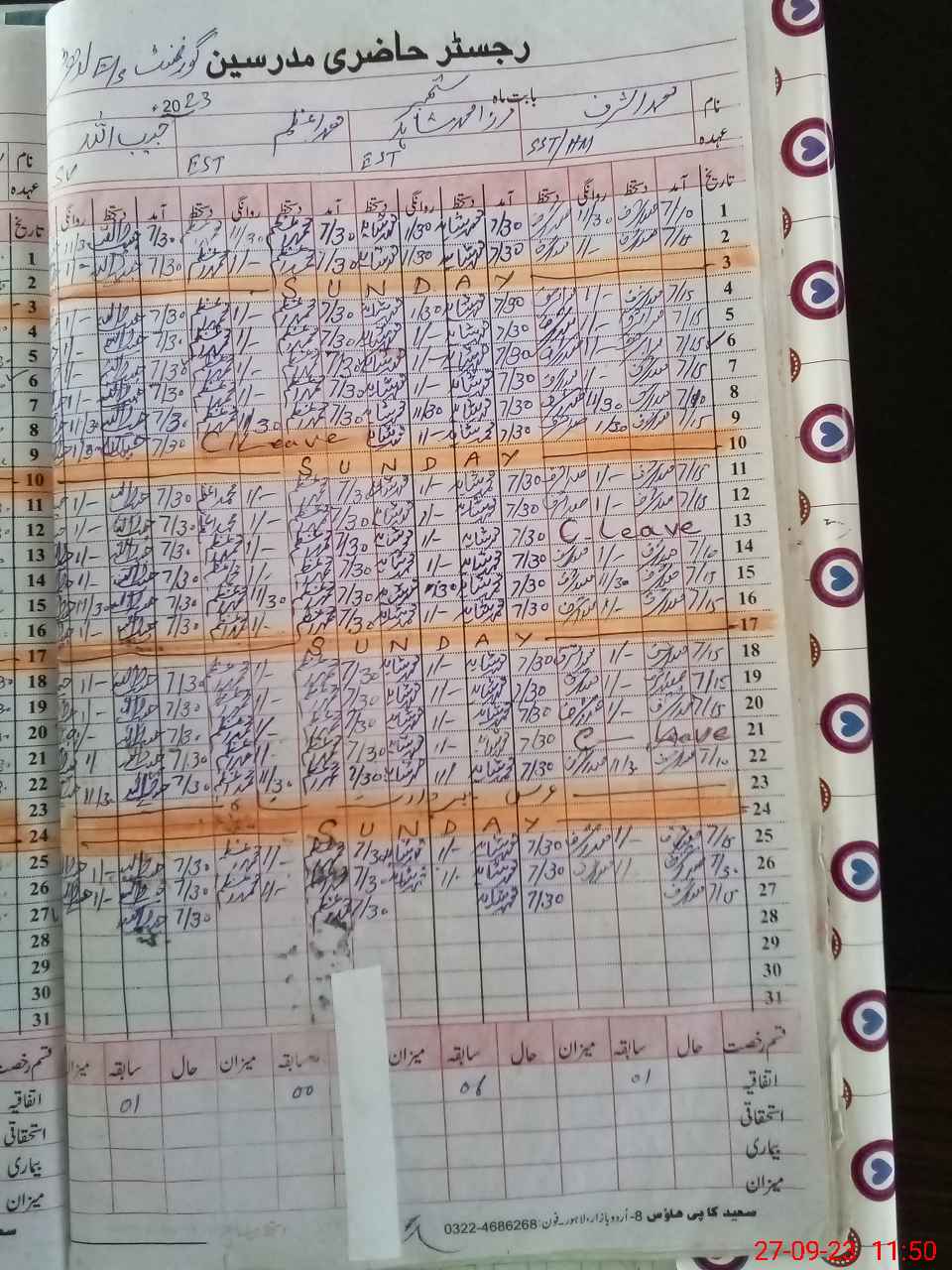 | CNIC | Full Name | Designation | R/C | Absence During Last Calender Month |