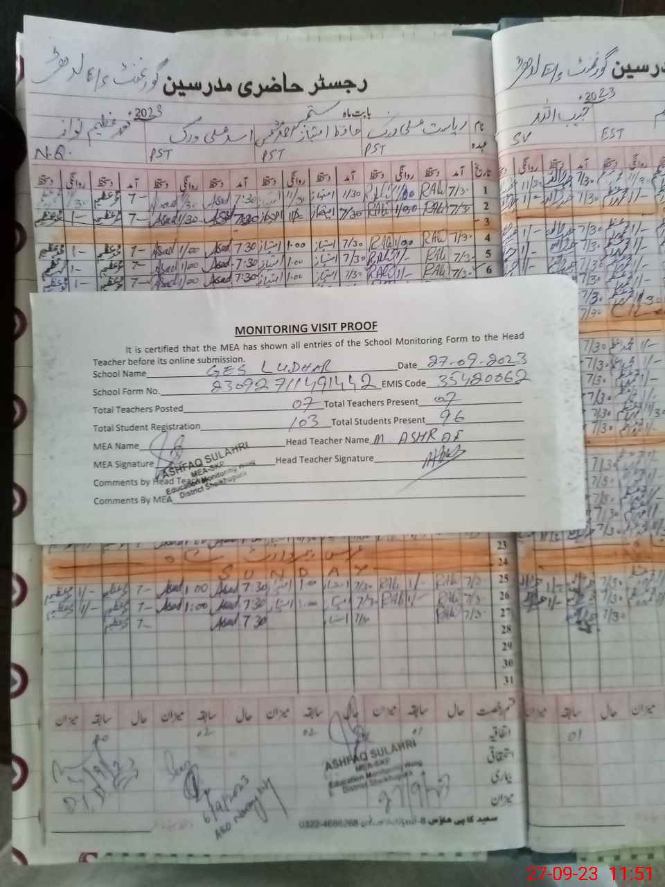 | Attendance Register | Head Teacher | MEA with School | Visit Proof |