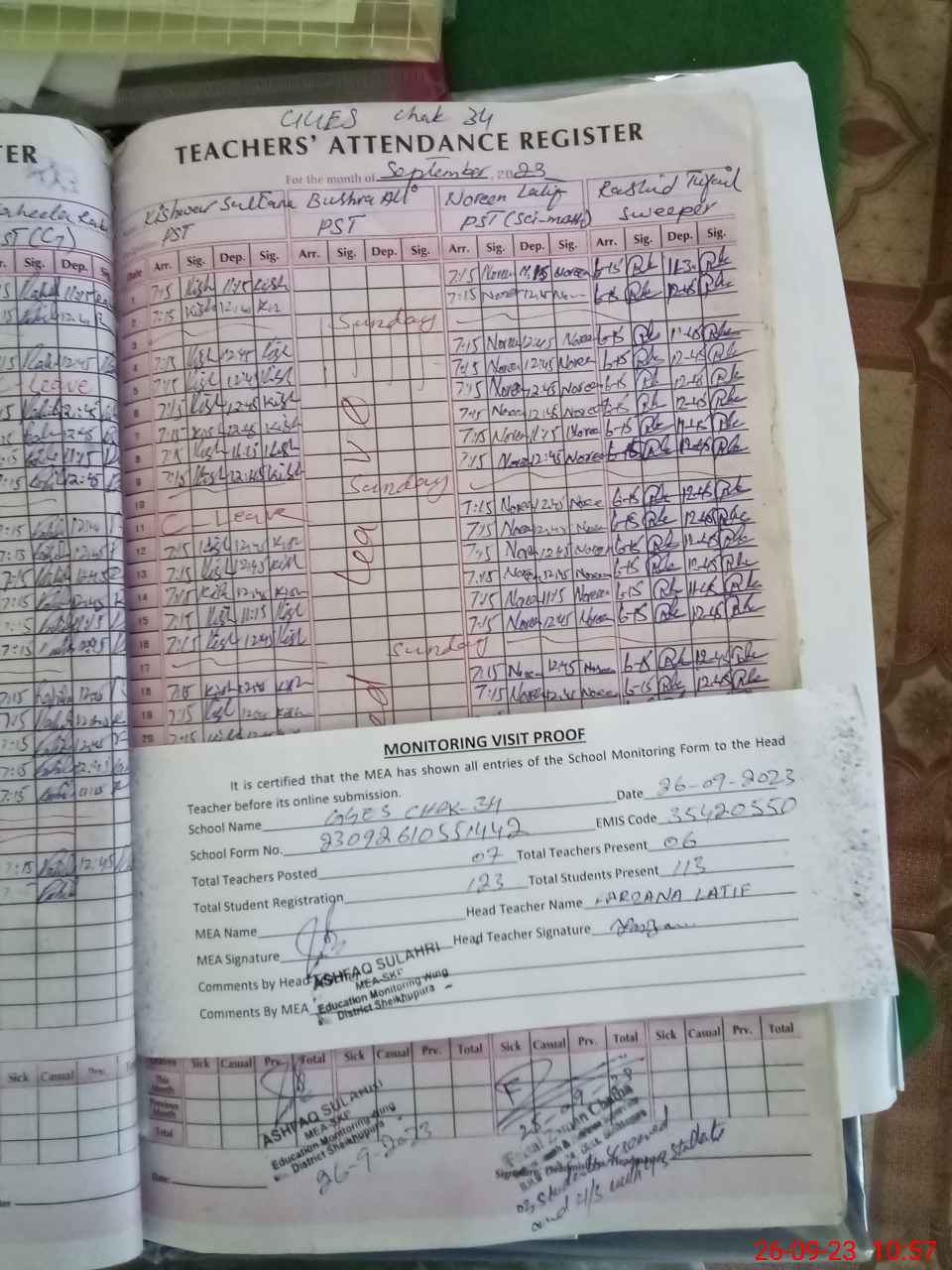 | Attendance Register | Head Teacher | MEA with School | Visit Proof |