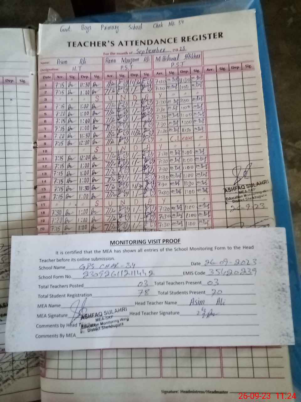 | Attendance Register | Head Teacher | MEA with School | Visit Proof |