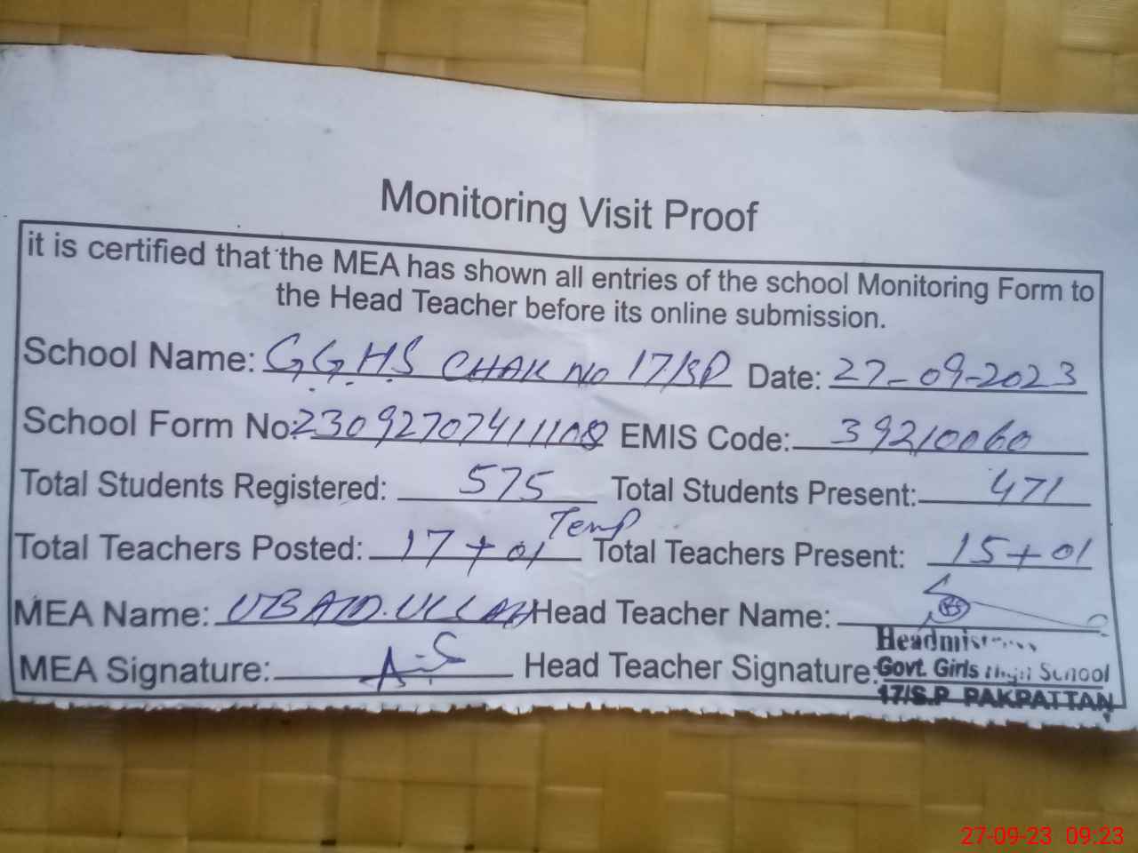 | EMIS Code: 39210060 | Name of School: GGHS 17/SP PAKPATTAN | |||