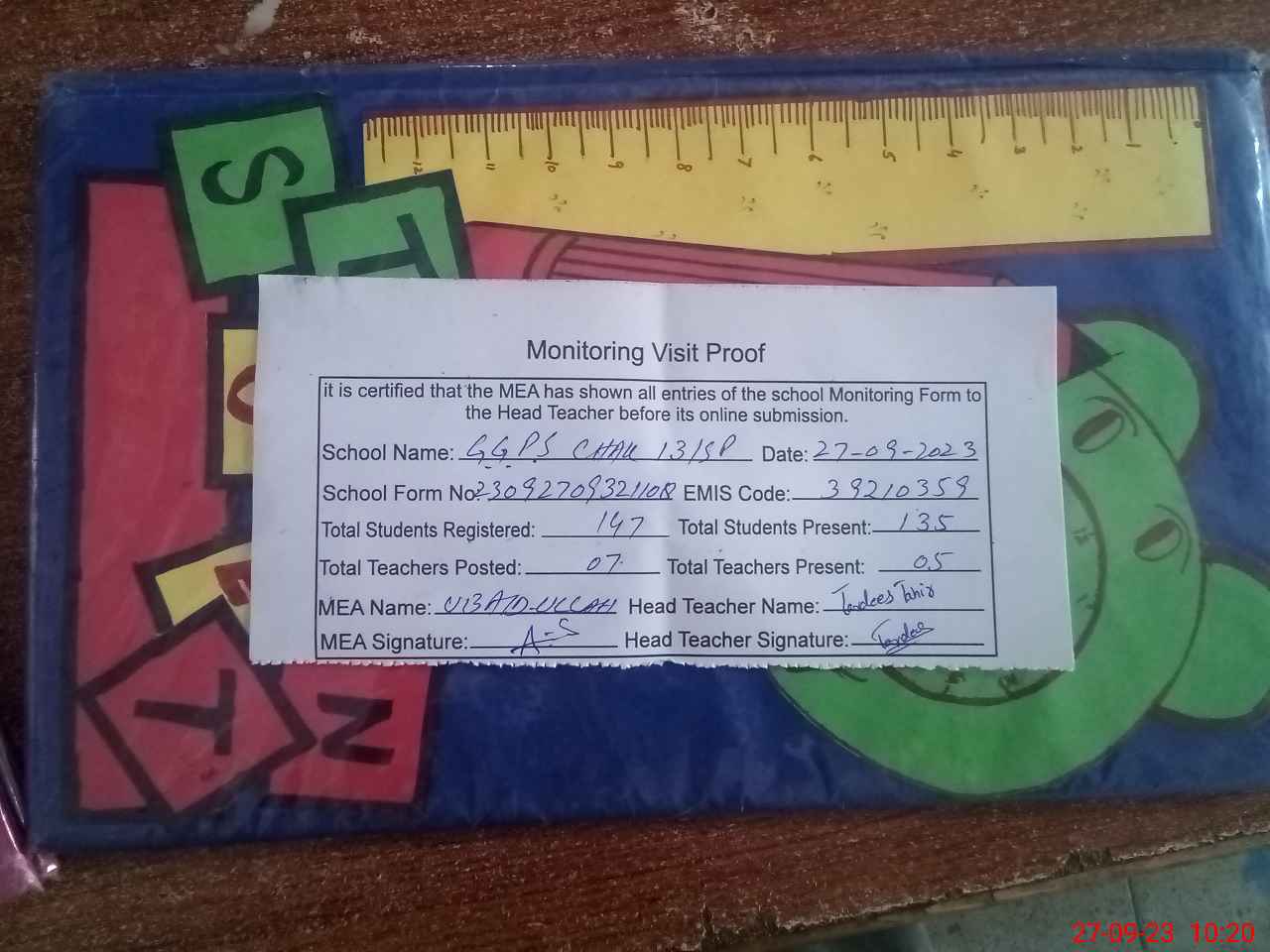 | Attendance Register | Head Teacher | MEA with School | Visit Proof |