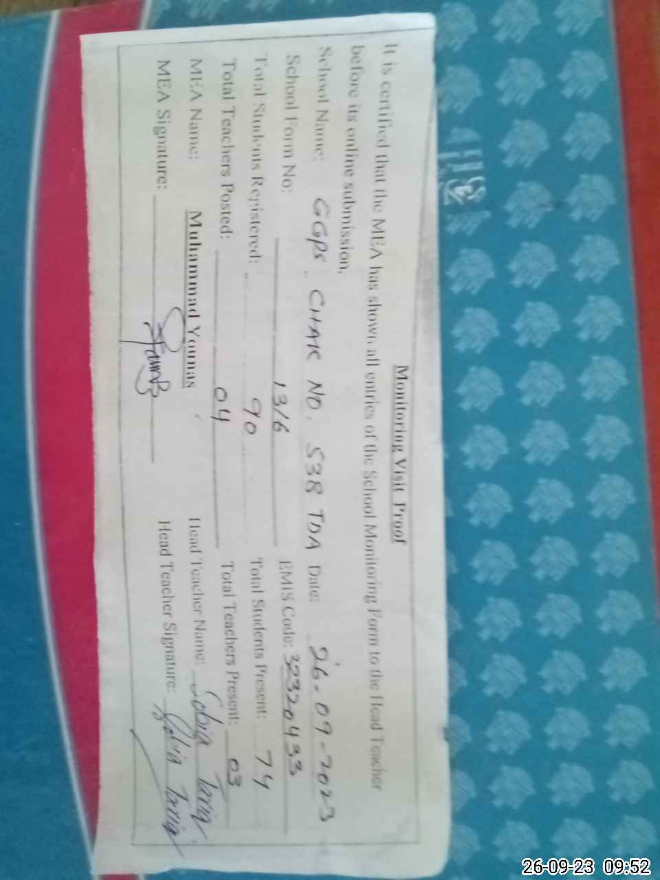 | EMIS Code: 32320433 | Name of School: GGPS CHAK NO. 538 TDA | |||