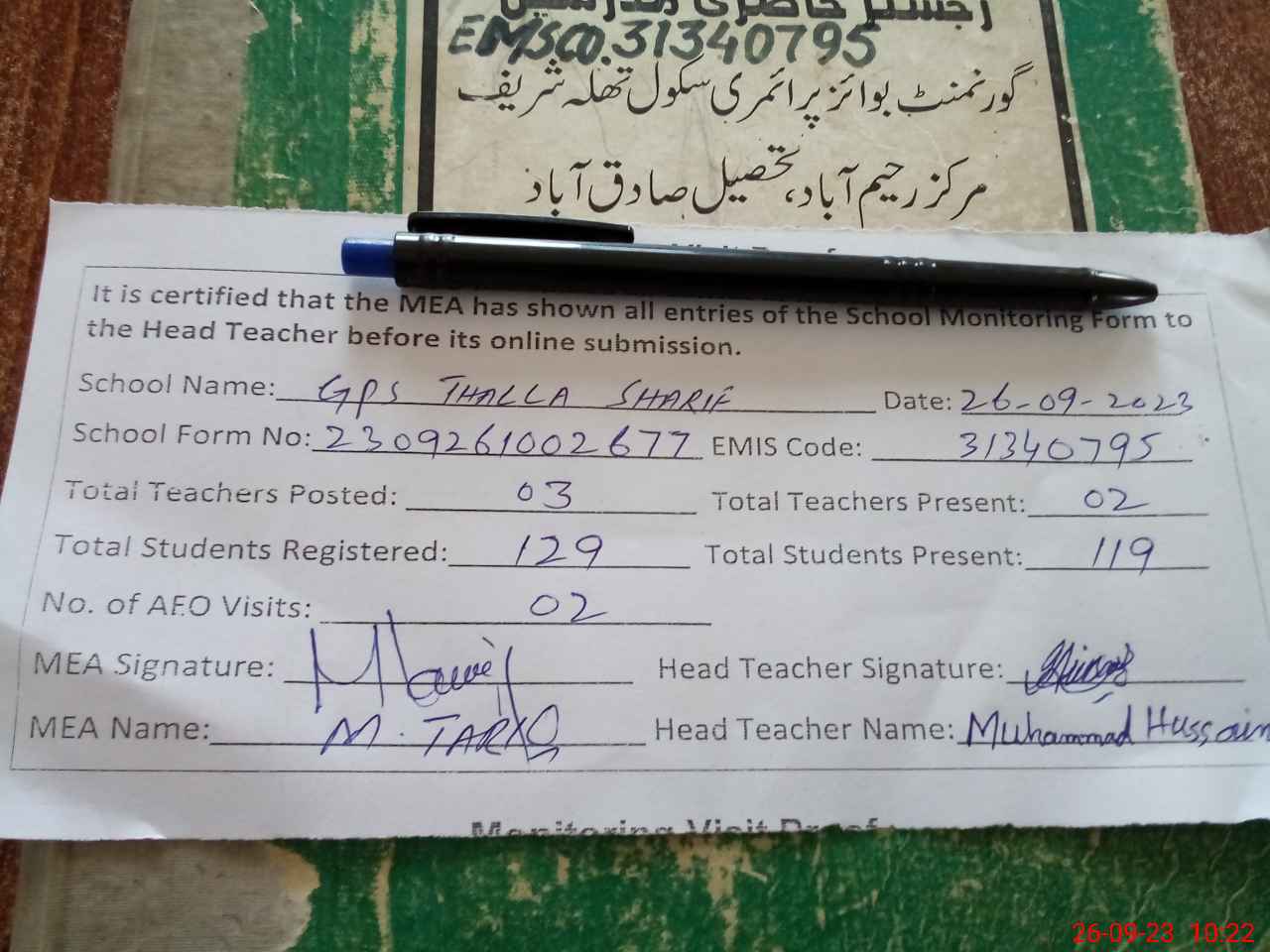 | EMIS Code: 31340795 | Name of School: GPS THALLA SHARIF | |||