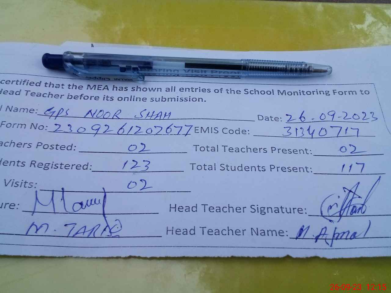 | Attendance Register | Head Teacher | MEA with School | Visit Proof |
