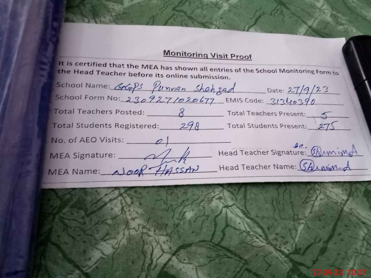 | Attendance Register | Head Teacher | MEA with School | Visit Proof |