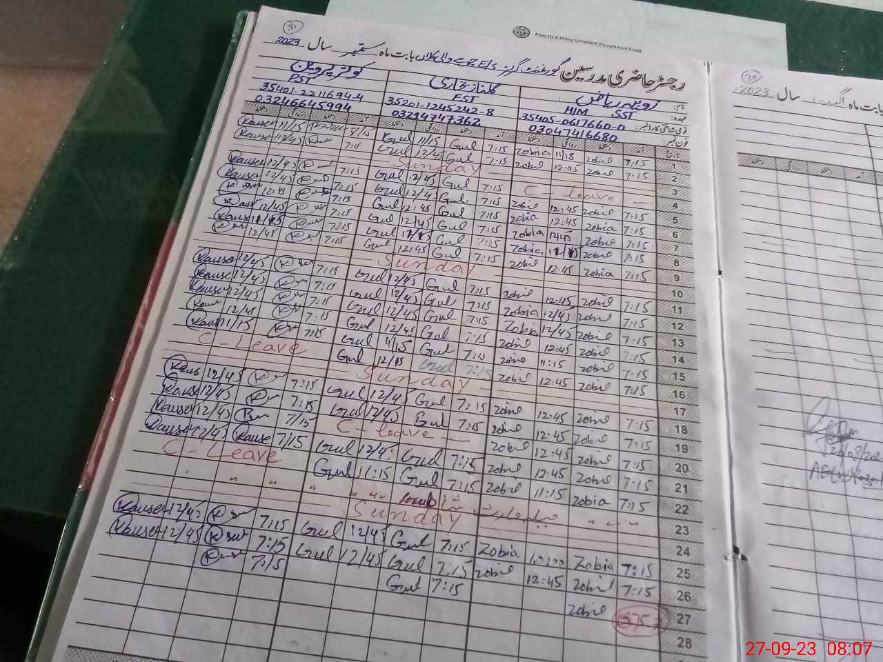 | CNIC | Full Name | Designation | R/C | Absence During Last Calender Month |
