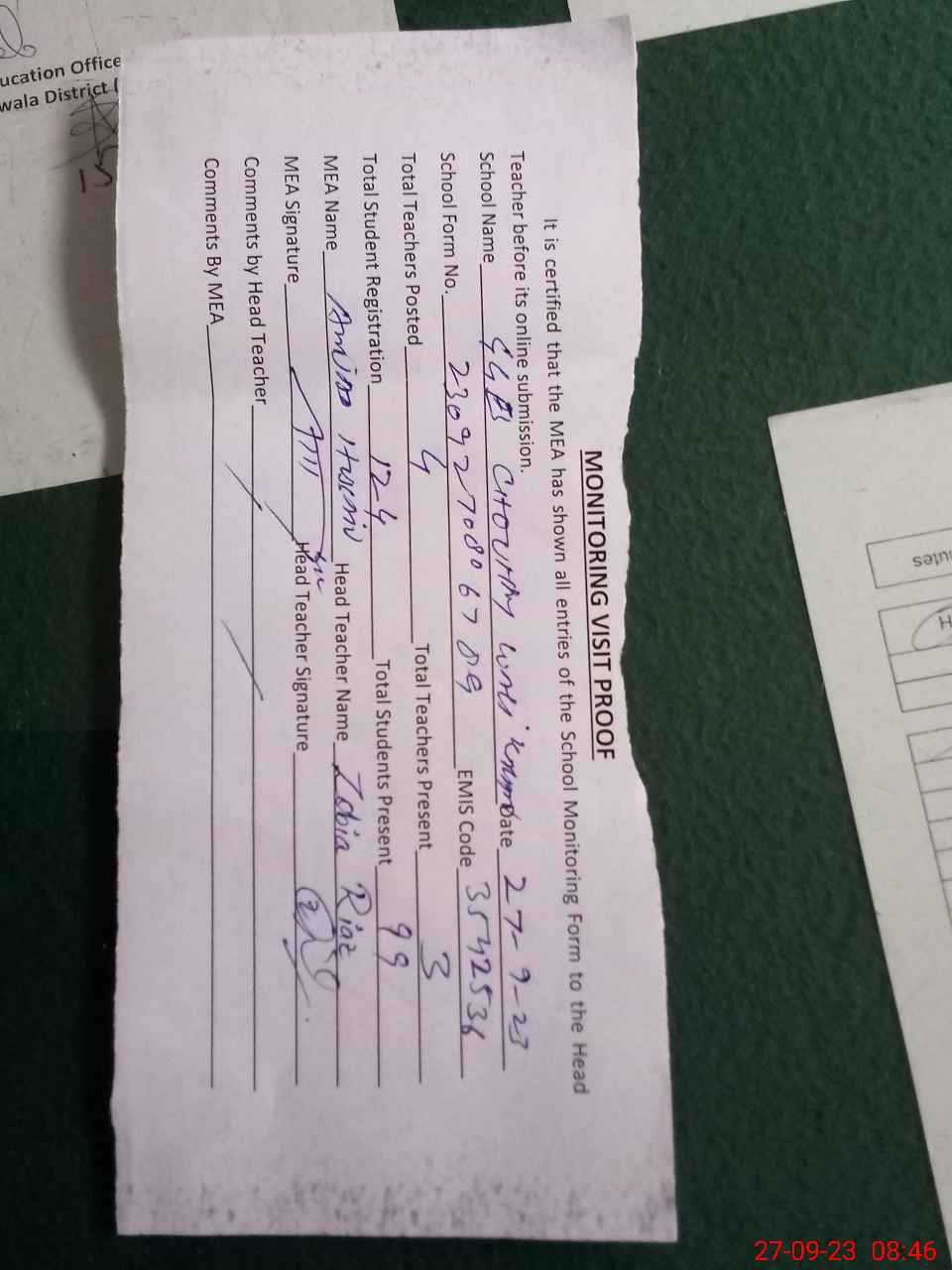 | Attendance Register | Head Teacher | MEA with School | Visit Proof |