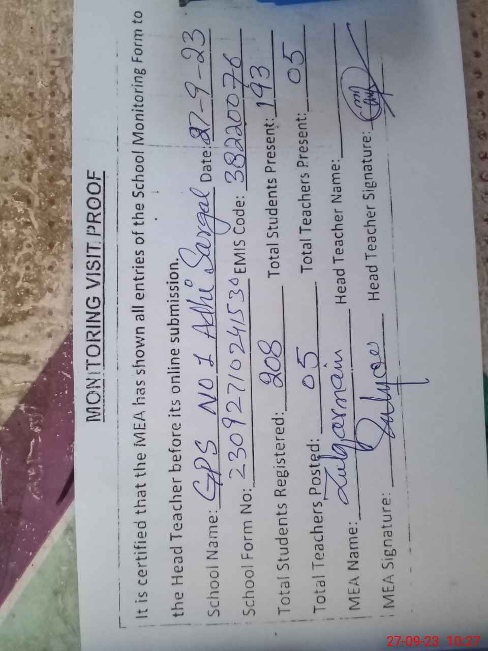 | EMIS Code: 38220076 | Name of School: GPS NO. 1 ADHI SARGAL | |||