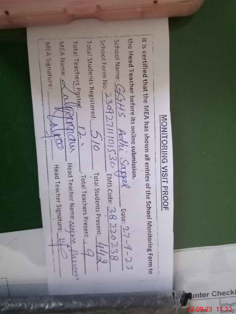 | Attendance Register | Head Teacher | MEA with School | Visit Proof |