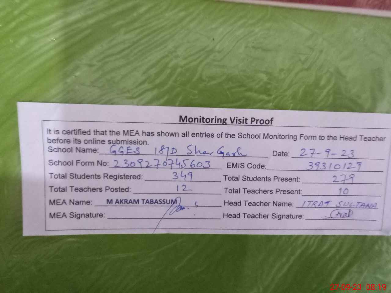 | Attendance Register | Head Teacher | MEA with School | Visit Proof |