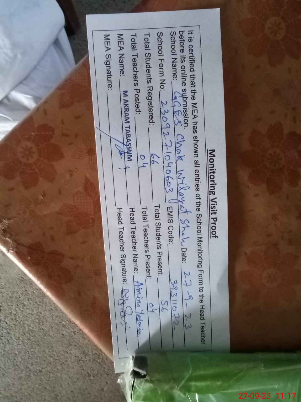 | Attendance Register | Head Teacher | MEA with School | Visit Proof |