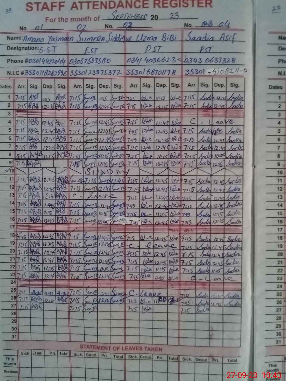 | CNIC | Full Name | Designation | R/C | Absence During Last Calender Month |